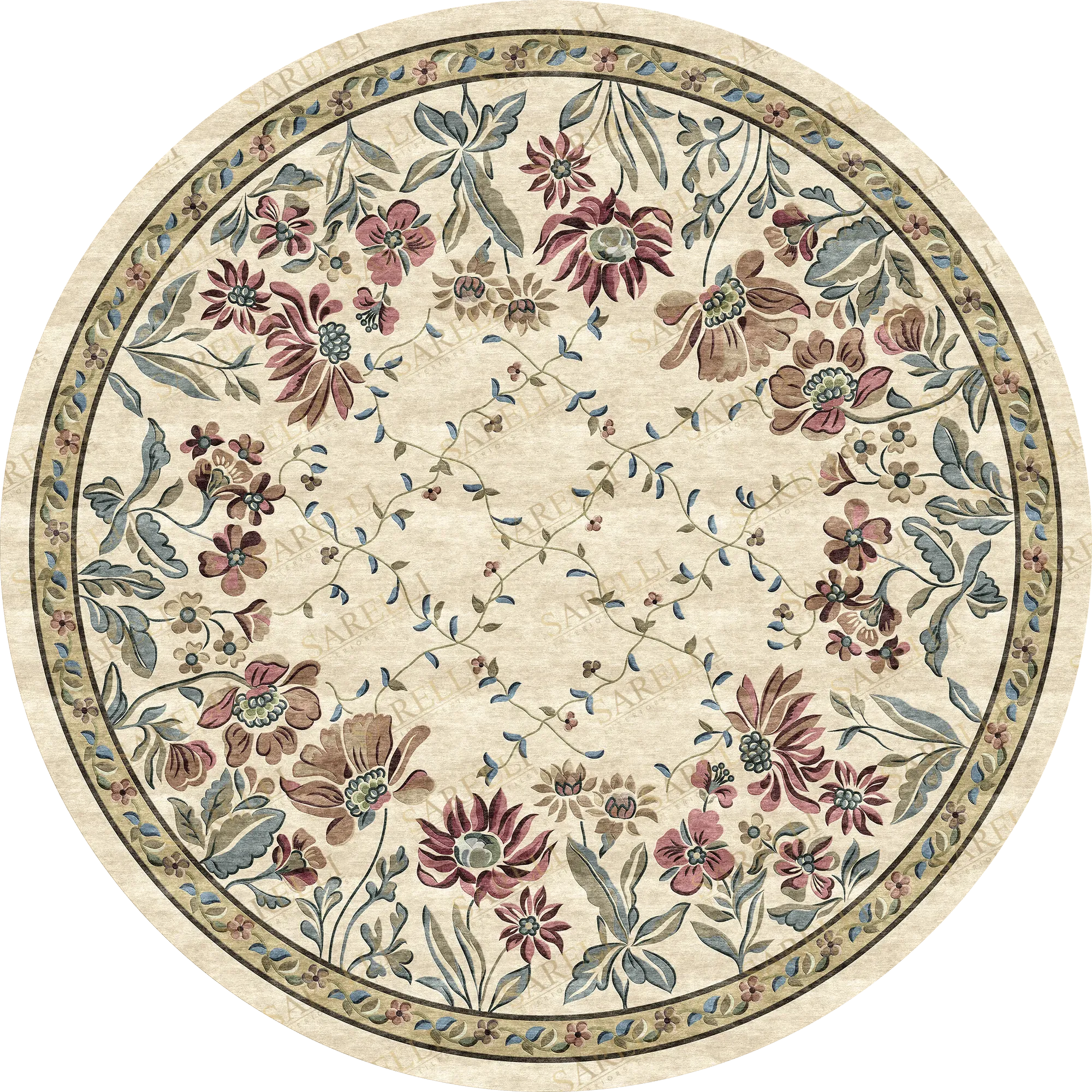 Graceful and full of quiet charm, the Wildflower Majilis Garden rug from Sarelli Interiors Textiles captures the beauty of nature in a refined circular form. Delicate wild blooms and meandering vines are arranged with botanical precision, forming a soft lattice pattern across its subtly shimmering surface. The combination of high and low pile adds texture and depth, giving the design a gentle, organic movement that brings the ... Read more